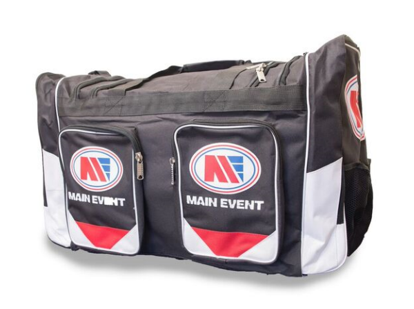 Main Event Large Sports Gear Kit Gym Bag Holdall - Size ( inches ) 24" Length + 14" Wide + 14" High, making an ideal size holdall for all your boxing kit. This bag was designed by boxing people that have thought of everything - There is a small zipped compartment on the top to house your skipping ropes - There are 2 seperate zipped compartments on one of the sides, which can house your gumshields in one and your handwraps in the other, so no more stress of searching through your kit bag looking for them... At each end of the bag there are 2 elasticated netting compartments, so you can carry your water bottles without the worry of them leaking inside of the bag... there is also another zipped compartment at each end, behind the netting which is lined so you can put your damp clothing in after training... There is a large zipped compartment on one side to keep your paperwork in safely, which will fit up to A4 size... There is a padded carry handle and a padded detachable shoulder strap - This Bag is a tough heavy duty peice of equipment as you would expect from Main Event.