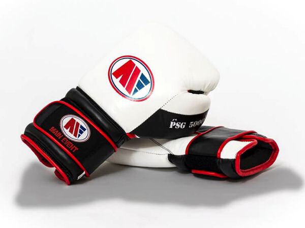 Main Event PSG 5000 Pro Spar Boxing Gloves Velcro White Black - Main Event have developed these top spec sparring gloves over 24 months of continued gym trials throughout the UK - The inner padding is constructed using the finest triple layered combination, of both high density impact and open cell soft inner foams that help to provide a comfortable all round fit - The gloves are ergonomically contoured to follow the natural shape of the hand - This allows for easy fist closure and promotes correct punching technique, which in turn can help reduce the risk of injury - The wrist has a shock absorbing style padding with a leather strap and velcro fastening to help provide the wrist with further protection - These gloves are an ideal all round training glove - They are supplied in a handy gym carry bag.