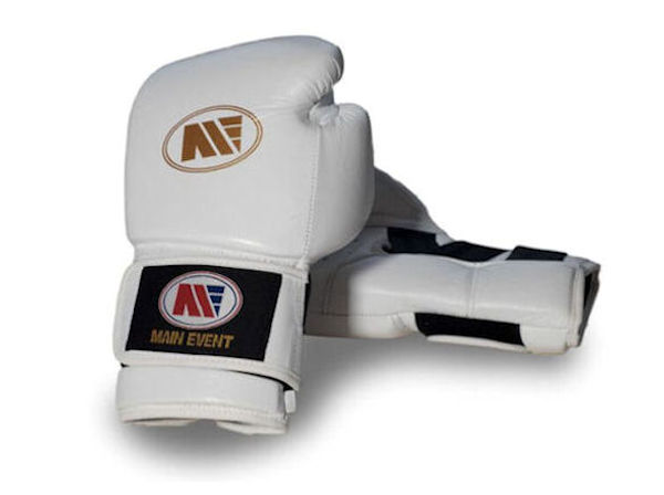 Main Event Titanium Hook and Loop Pro Spar Boxing Gloves White Gold - Sleek and snug fitting, designed to mould to your hands after a few sessions in the gym. One of the best leather boxing gloves currently on the market, with a dual hook and loop nylon Velcro strap fastening system that not only secures the gloves tight, but also helps to hold the wrist in a firm position. Using the latest PSG 7000 Technology and made from a high grade leather, these gloves have been trialled throughout gyms in the UK at all levels and come out with fantastic reviews. Main Event have developed these top spec training gloves over 24 months, The inner padding is constructed using the finest triple layered combination, of both high density impact and open cell soft inner foams that help to provide a comfortable all round tight fit that is designed to mould to your hand. The gloves are ergonomically contoured to follow the natural shape of the hand, This allows for easy fist closure and promotes correct punching technique, which in turn can help reduce the risk of injury. These gloves are an ideal all round training and sparring glove - They are supplied in a handy gym carry bag.